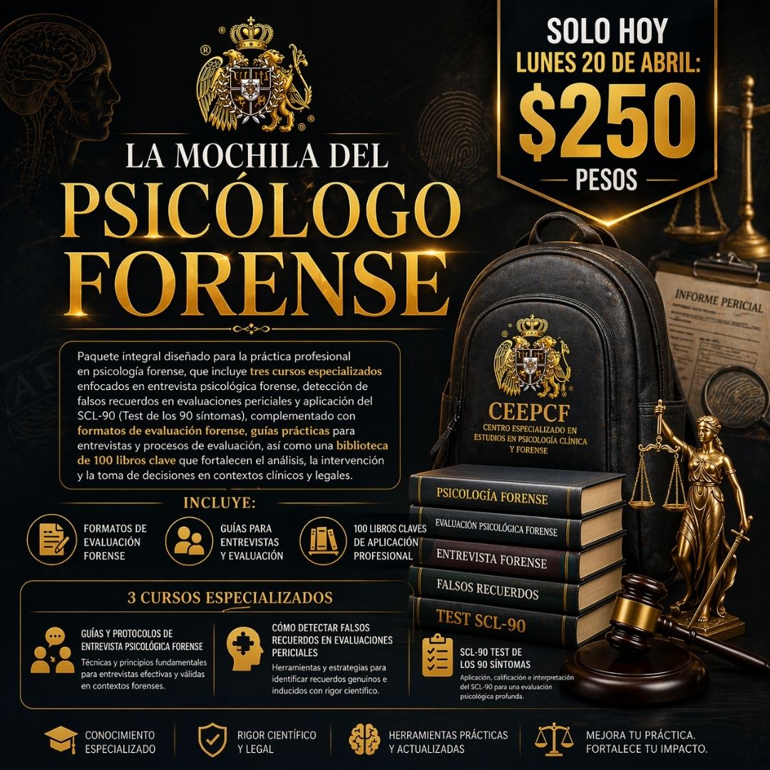 LA MOCHILA DEL PSICÓLOGO FORENSE  es un paquete integral diseñado para la práctica profesional en el ámbito clínico y legal, que reúne formación especializada, herramientas de evaluación, guías técnicas y una biblioteca profesional orientada al análisis, la intervención y la toma de decisiones en contextos forenses. Este sistema incluye tres cursos clave: entrevista psicológica forense, detección de falsos recuerdos en evaluaciones periciales y aplicación del SCL-90-R, además de formatos profesionales, protocolos de entrevista y recursos clínicos que permiten al especialista desarrollar evaluaciones sólidas, éticas y técnicamente fundamentadas. Todo el contenido está estructurado para fortalecer habilidades en la elaboración de informes periciales, análisis del testimonio y evaluación psicopatológica con enfoque jurídico.