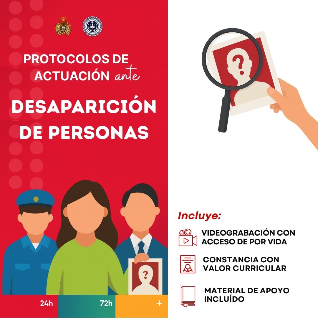 La desaparición de personas representa una de las problemáticas más complejas y dolorosas de nuestro contexto social. Comprender los protocolos legales y procedimientos de actuación resulta esencial para garantizar una búsqueda oportuna, eficaz y con enfoque de derechos humanos. Este curso ofrece una orientación jurídica y profesional, útil para abogados, psicólogos, trabajadores sociales, servidores públicos, cuerpos de emergencia y público interesado en comprender cómo se estructura y aplica la respuesta institucional frente a estos casos.